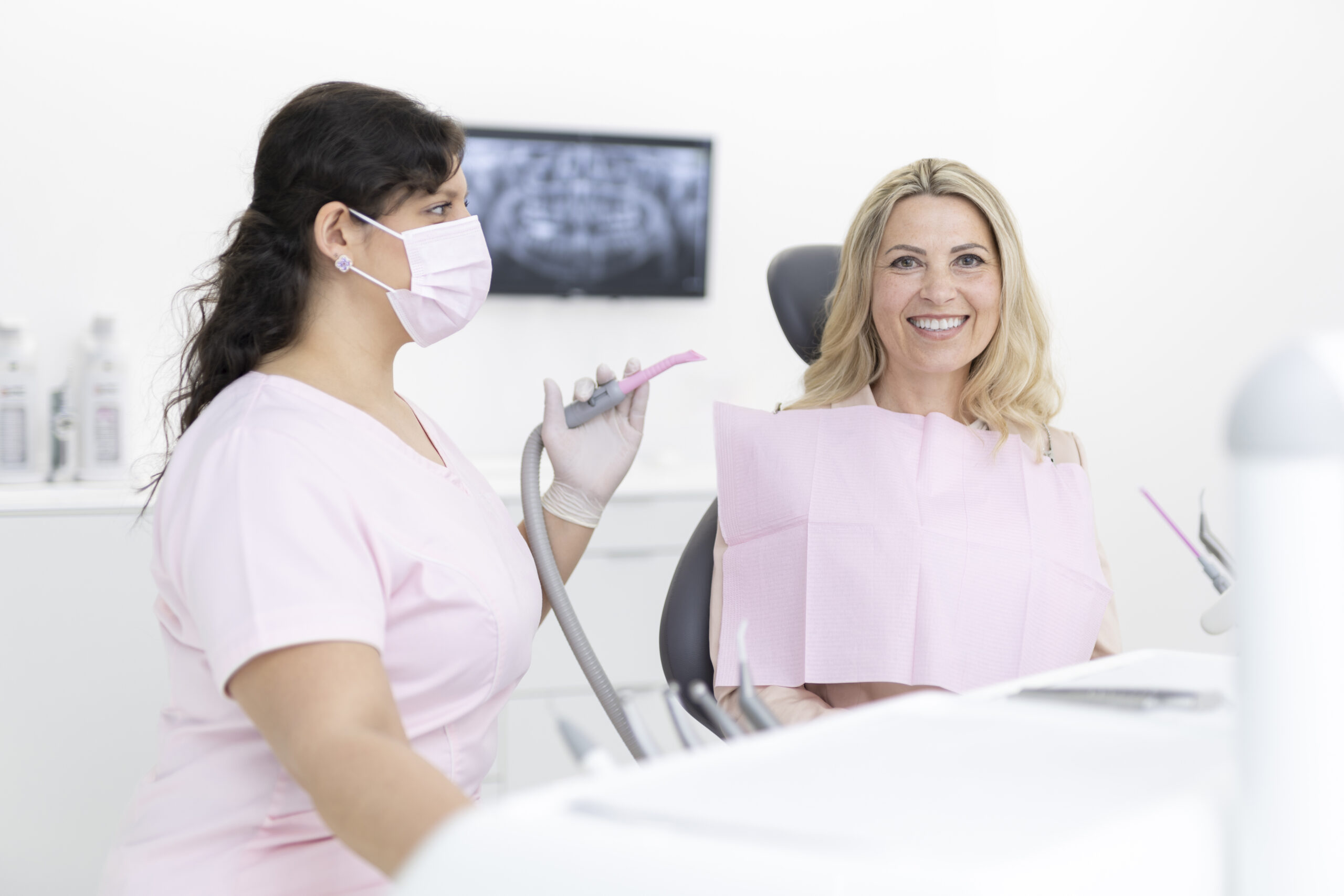 In-Office-Bleaching: In nur einer Sitzung in unserer Praxis erreichen wir mit hochkonzentriertem Bleichgel und Laserbestrahlung eine sofortige Aufhellung.